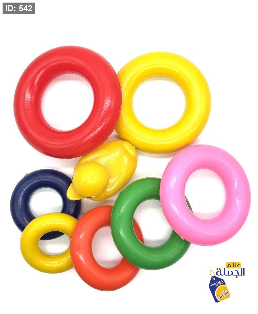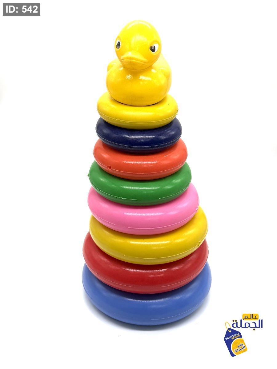 لعبة تعليمية على شكل هرم مع قطع ملونة وبطة لطيفة في الأعلى تساعد الأطفال على تعلم الأحجام،الألوان والترتيب بطريقة ممتعة