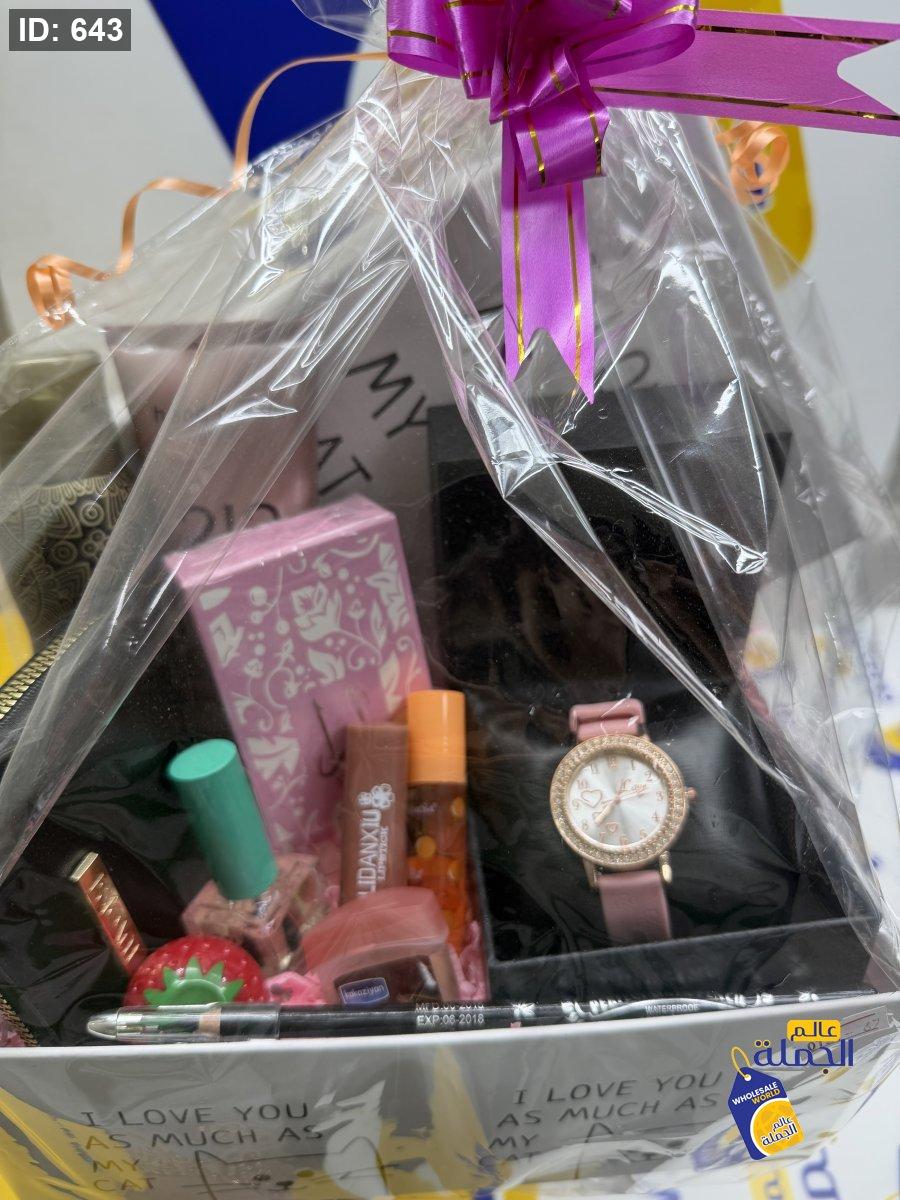 بكج مميزة عبارة عن ساعة، حومرة قلم ، مرطب شفايف شكل فرولة ، قلم سحري ، فازلين ، كريم 212، سبري ، جزدان ،مناكير شفاف